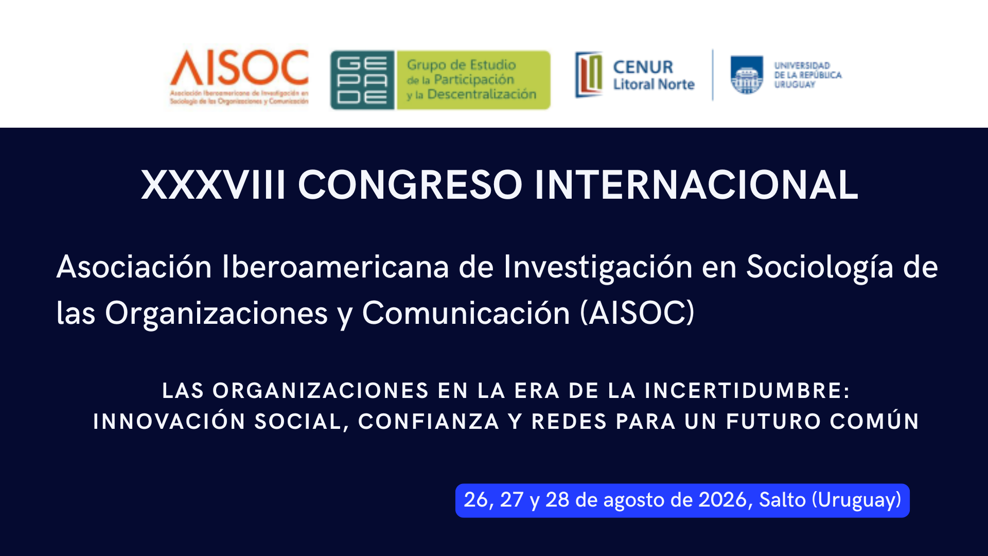 Los días 26, 27 y 28 de agosto de 2026, Salto (Uruguay), en la Universidad de la República, Cenur Litoral Norte, Sede Salto, se llevará a cabo el XXXVIII Congreso Internacional por la Asociación Iberoamericana de Investigación en Sociología de las Organizaciones y Comunicación (AISOC). con el título «Las organizaciones en la era de la incertidumbre: innovación social, confianza y redes para un futuro común».